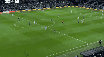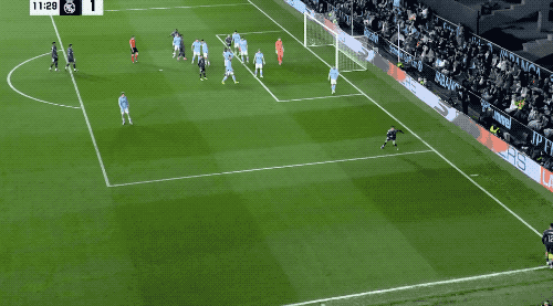 第11分钟,皇马开出战术角球,居莱尔倒三角传中,琼阿梅尼无人盯防的情况下,推射中柱,皮球弹进球门。